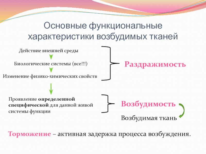 Слайд 2Основные функциональные характеристики возбудимых тканей