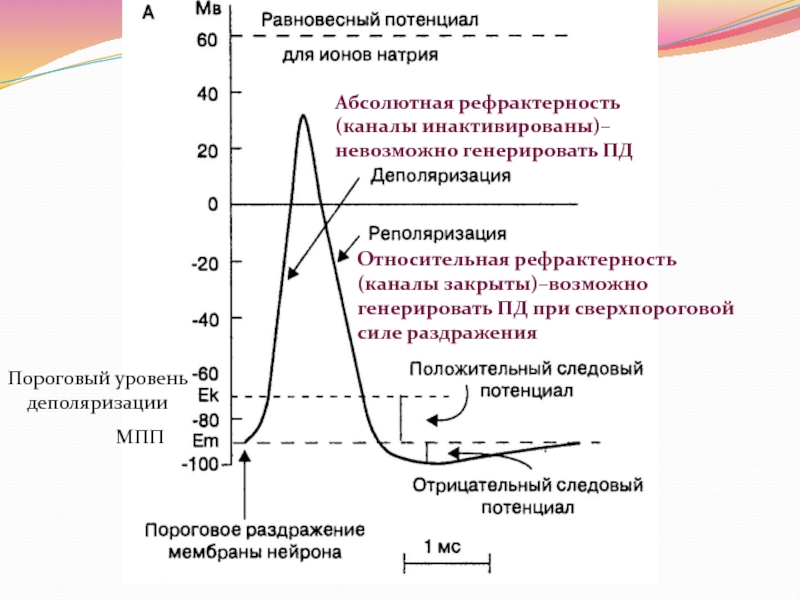 Абсолютная рефрактерность (каналы инактивированы)– невозможно генерировать ПД