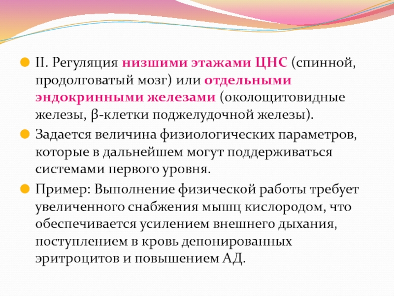 Слайд 12II. Регуляция низшими этажами ЦНС (спинной, продолговатый мозг) или отдельными