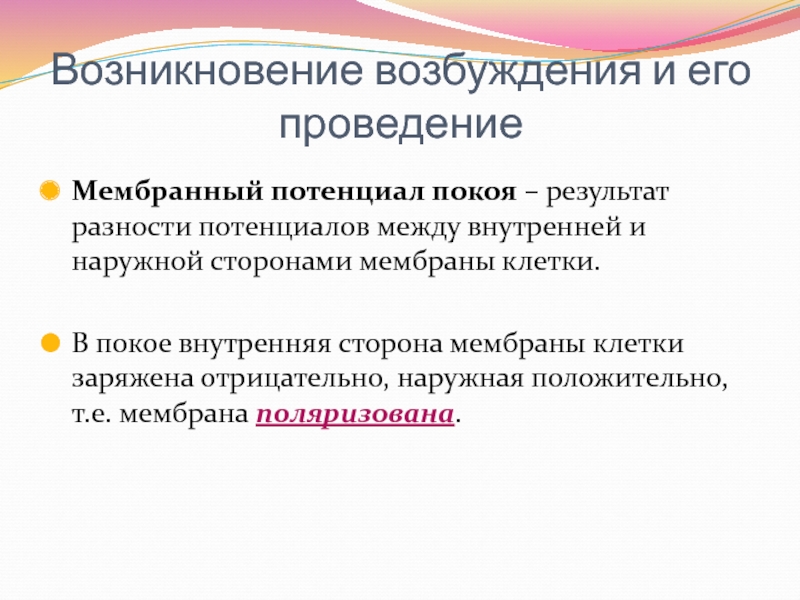 сторона мембраны клетки заряжена отрицательно, наружная положительно, т.е. мембрана поляризована.