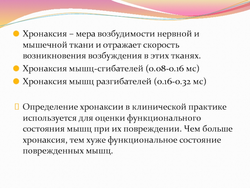 Слайд 7Хронаксия – мера возбудимости нервной и мышечной ткани и отражает