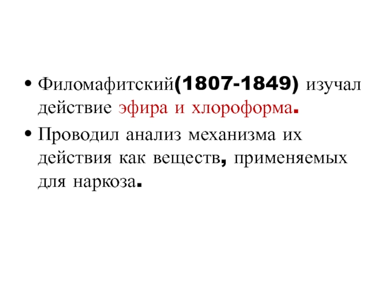 Филомафитский(1807-1849) изучал действие эфира и хлороформа.