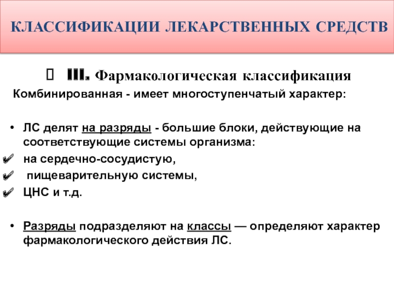 Разряды подразделяют на классы — определяют характер фармакологического действия ЛС.
