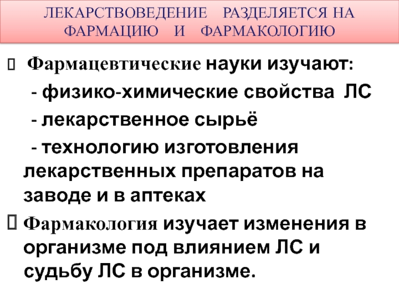 Слайд 6ЛЕКАРСТВОВЕДЕНИЕ РАЗДЕЛЯЕТСЯ НА ФАРМАЦИЮ И ФАРМАКОЛОГИЮ