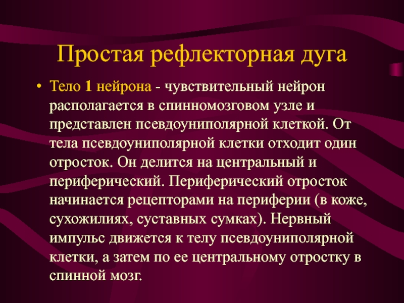 отходит один отросток. Он делится на центральный и периферический. Периферический отросток начинается рецепторами на периферии (в коже, сухожилиях, суставных сумках). Нервный импульс движется к телу псевдоуниполярной клетки, а затем по ее центральному отростку в спинной мозг.