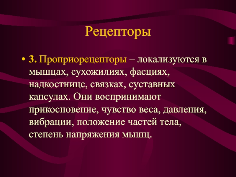 3. Проприорецепторы – локализуются в мышцах, сухожилиях, фасциях, надкостнице, связках,