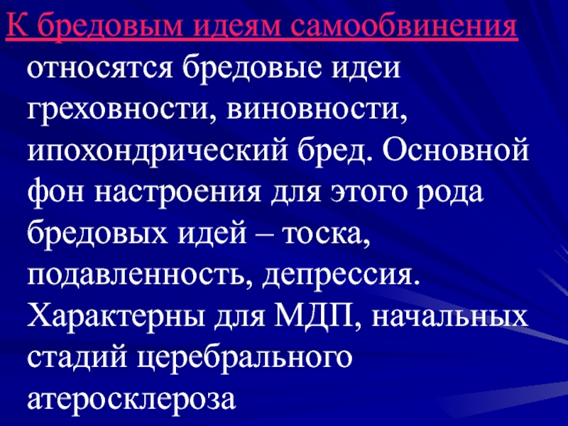 Слайд 29К бредовым идеям самообвинения относятся бредовые идеи греховности, виновности, ипохондрический