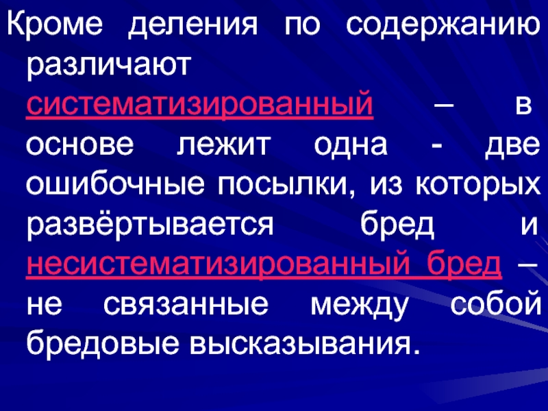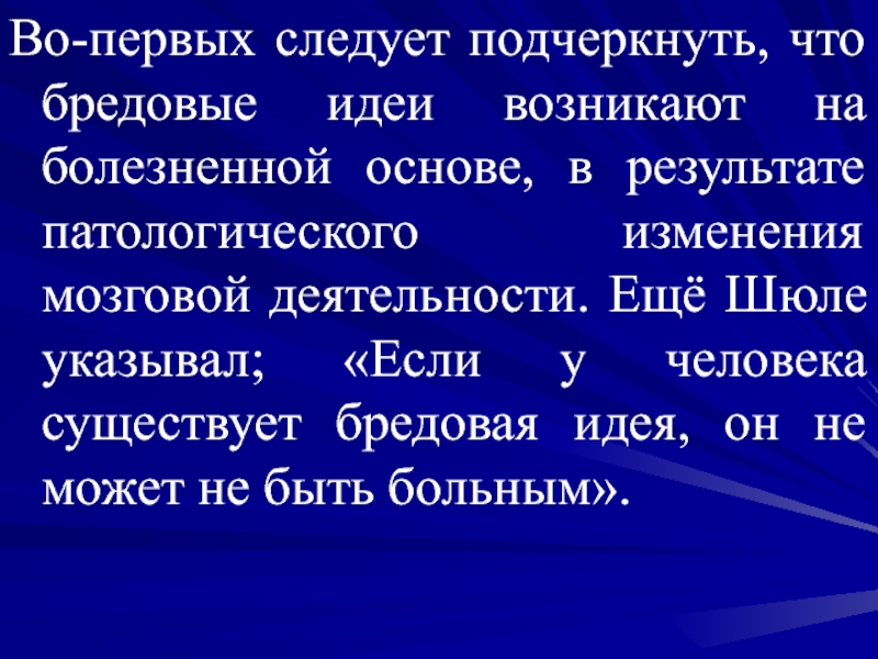 Слайд 7Во-первых следует подчеркнуть, что бредовые идеи возникают на болезненной основе,