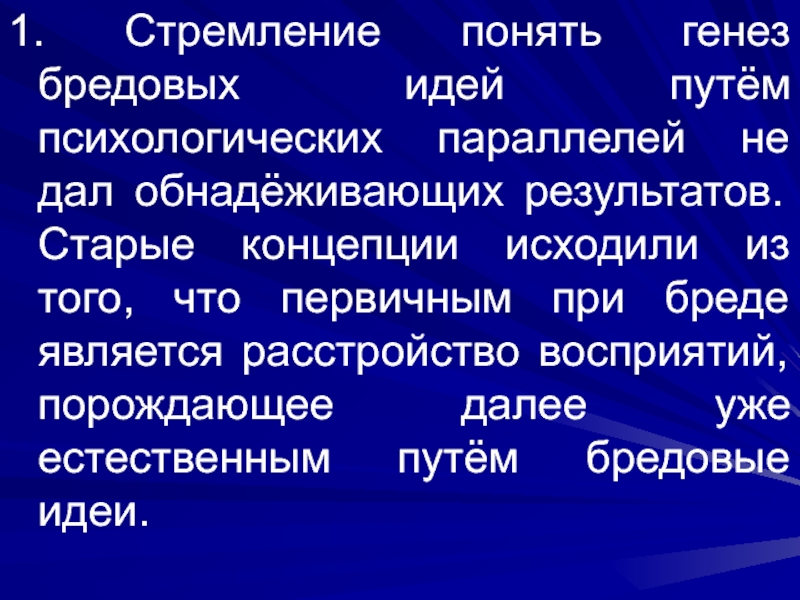 Слайд 111. Стремление понять генез бредовых идей путём психологических параллелей не