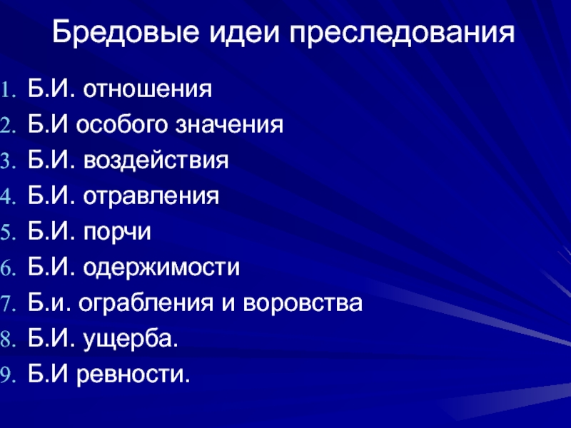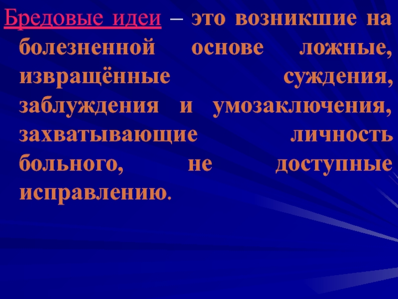Слайд 5Бредовые идеи – это возникшие на болезненной основе ложные, извращённые