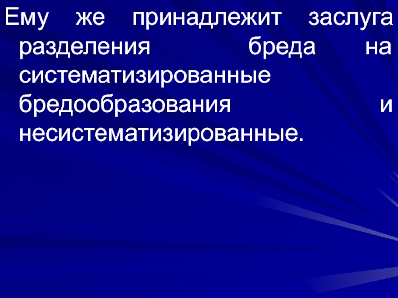 Слайд 19Ему же принадлежит заслуга разделения бреда на систематизированные бредообразования и