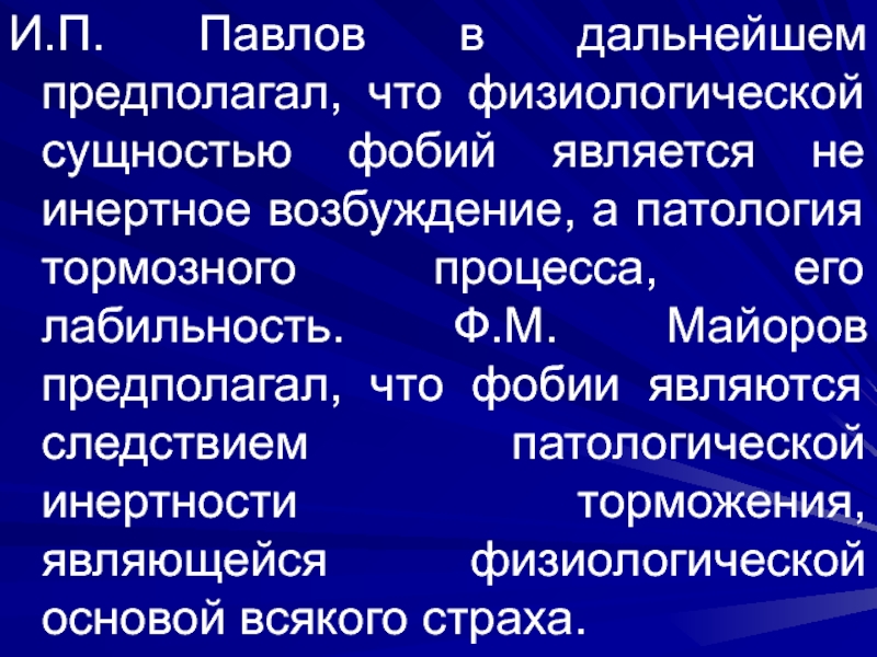 Майоров предполагал, что фобии являются следствием патологической инертности торможения, являющейся физиологической основой всякого страха.