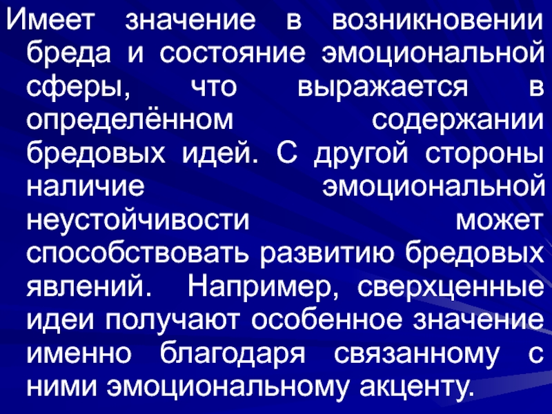 Слайд 23Имеет значение в возникновении бреда и состояние эмоциональной сферы, что
