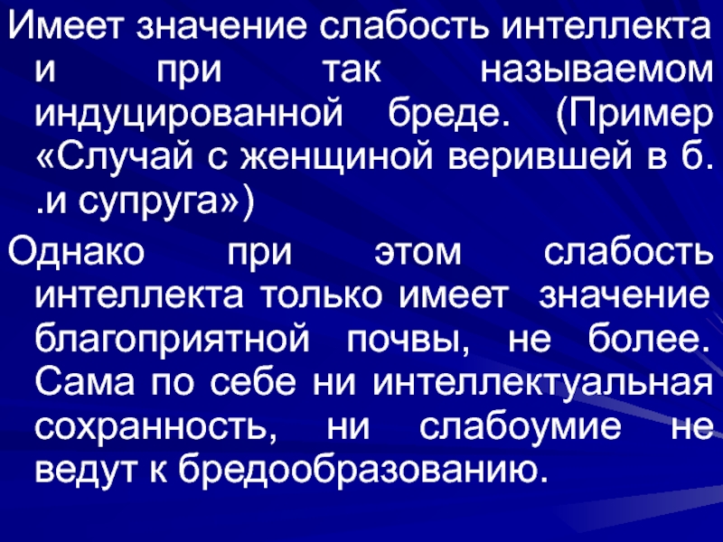 Слайд 15Имеет значение слабость интеллекта и при так называемом индуцированной бреде.