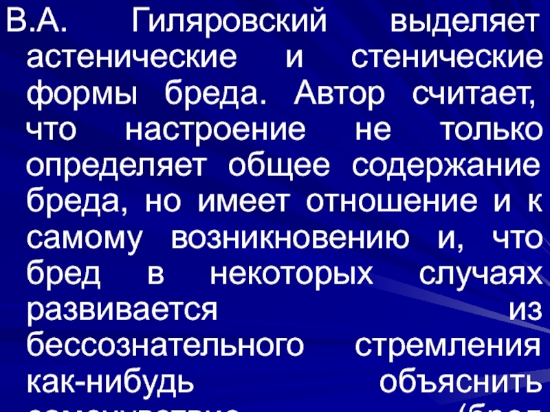 Слайд 20В.А. Гиляровский выделяет астенические и стенические формы бреда. Автор считает,