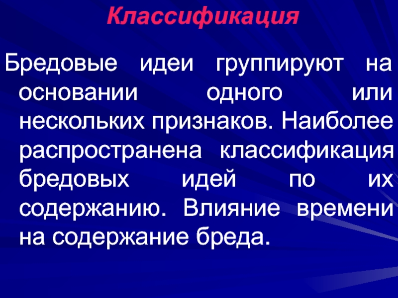Наиболее распространена классификация бредовых идей по их содержанию. Влияние времени