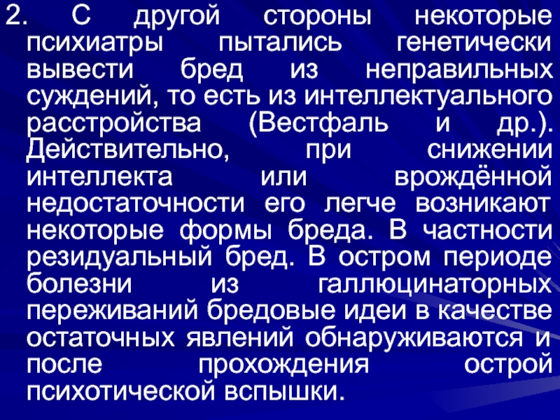 др.). Действительно, при снижении интеллекта или врождённой недостаточности его легче возникают некоторые формы бреда. В частности резидуальный бред. В остром периоде болезни из галлюцинаторных переживаний бредовые идеи в качестве остаточных явлений обнаруживаются и после прохождения острой психотической вспышки.