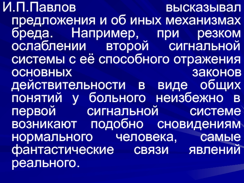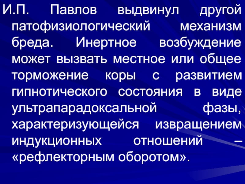 Слайд 39И.П.Павлов высказывал предложения и об иных механизмах бреда. Например, при