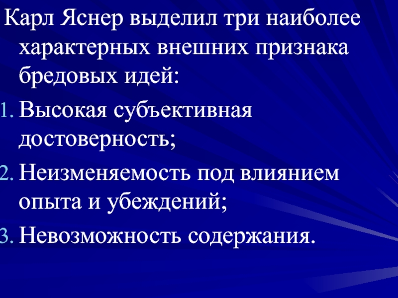 Слайд 9Карл Яснер выделил три наиболее характерных внешних признака бредовых идей:
