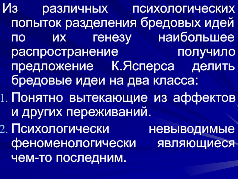 Слайд 18Из различных психологических попыток разделения бредовых идей по их генезу