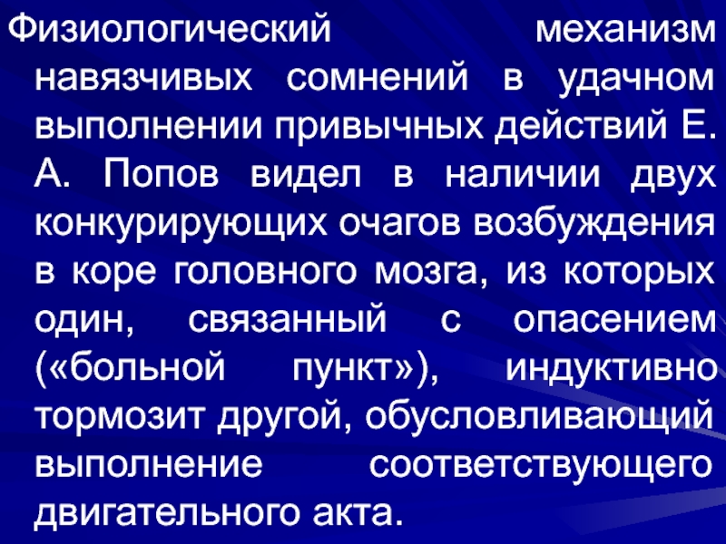 Слайд 58Физиологический механизм навязчивых сомнений в удачном выполнении привычных действий Е.А.