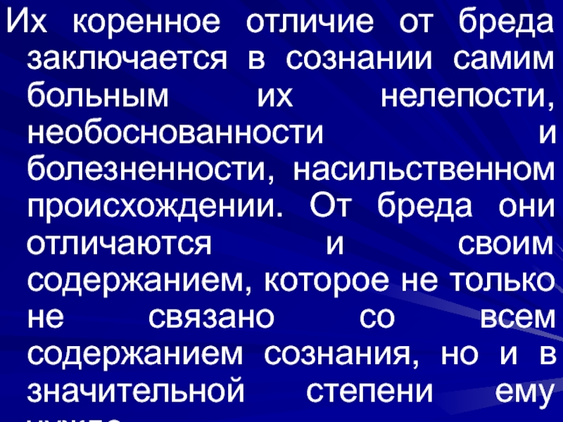 Слайд 45Их коренное отличие от бреда заключается в сознании самим больным