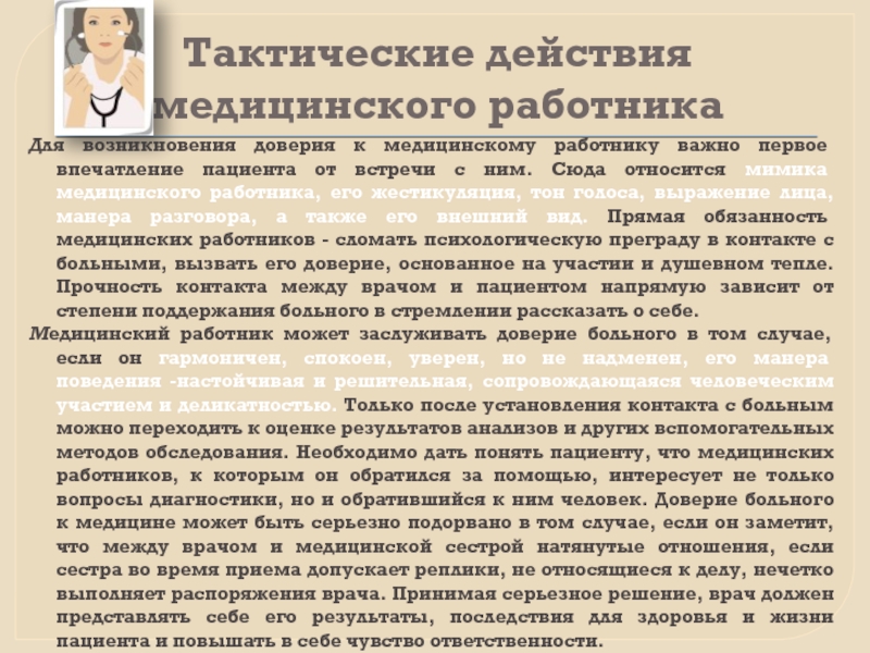 медицинского работника, его жестикуляция, тон голоса, выражение лица, манера разговора, а также его внешний вид. Прямая обязанность медицинских работников - сломать психологическую преграду в контакте с больными, вызвать его доверие, основанное на участии и душевном тепле. Прочность контакта между врачом и пациентом напрямую зависит от степени поддержания больного в стремлении рассказать о себе.