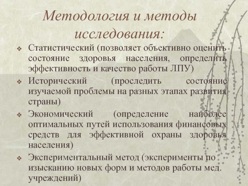 Экономический (определение наиболее оптимальных путей использования финансовых средств для эффективной охраны здоровья населения)
