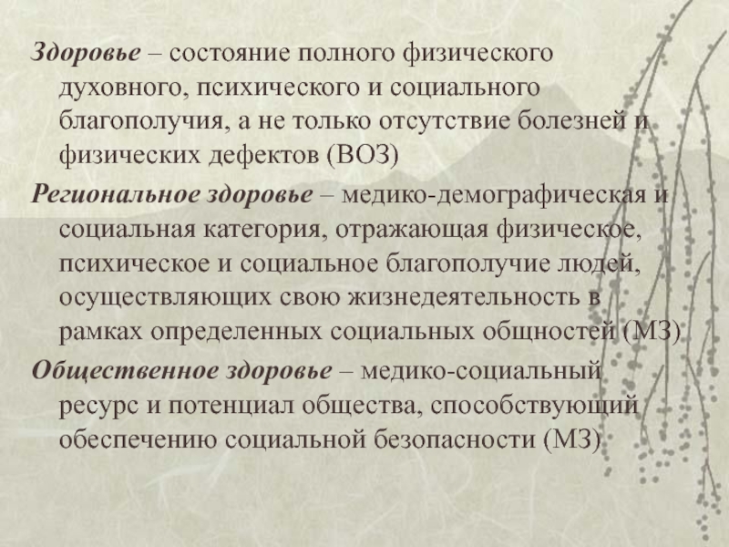 – медико-демографическая и социальная категория, отражающая физическое, психическое и социальное благополучие людей, осуществляющих свою жизнедеятельность в рамках определенных социальных общностей (МЗ)