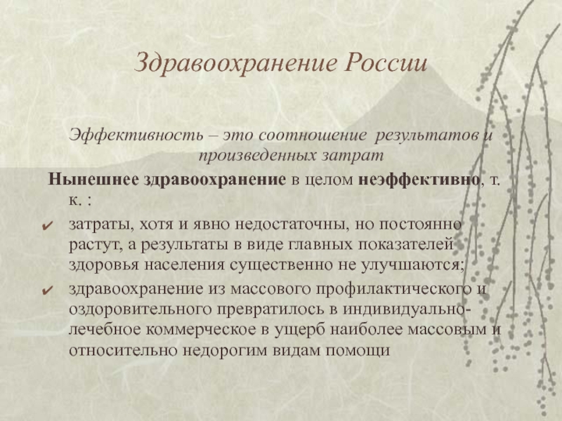 здравоохранение из массового профилактического и оздоровительного превратилось в индивидуально-лечебное коммерческое в ущерб наиболее массовым и относительно недорогим видам помощи