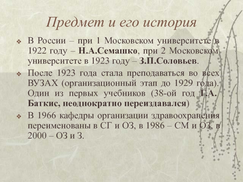 После 1923 года стала преподаваться во всех ВУЗАХ (организационный этап до 1929 года). Один из первых учебников (38-ой год Г.А. Баткис, неоднократно переиздавался)