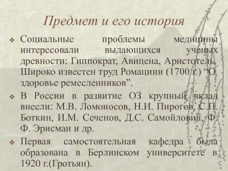 В России в развитие ОЗ крупный вклад внесли: М.В. Ломоносов, Н.И. Пирогов, С.П. Боткин, И.М. Сеченов, Д.С. Самойлович, Ф.Ф. Эрисман и др.