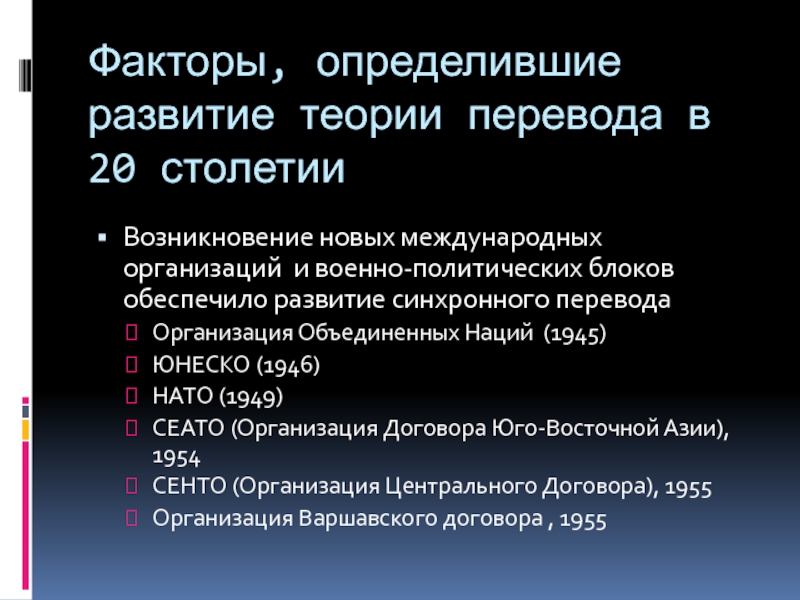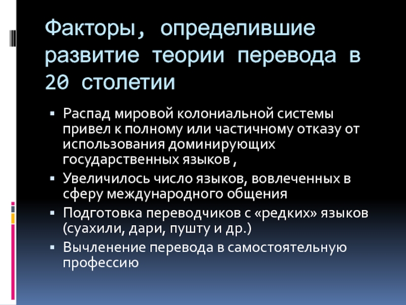 Слайд 10Факторы, определившие развитие теории перевода в 20 столетии