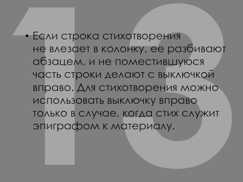 Если строка стихотворения не влезает в колонку, ее разбивают абзацем, и не поместившуюся часть