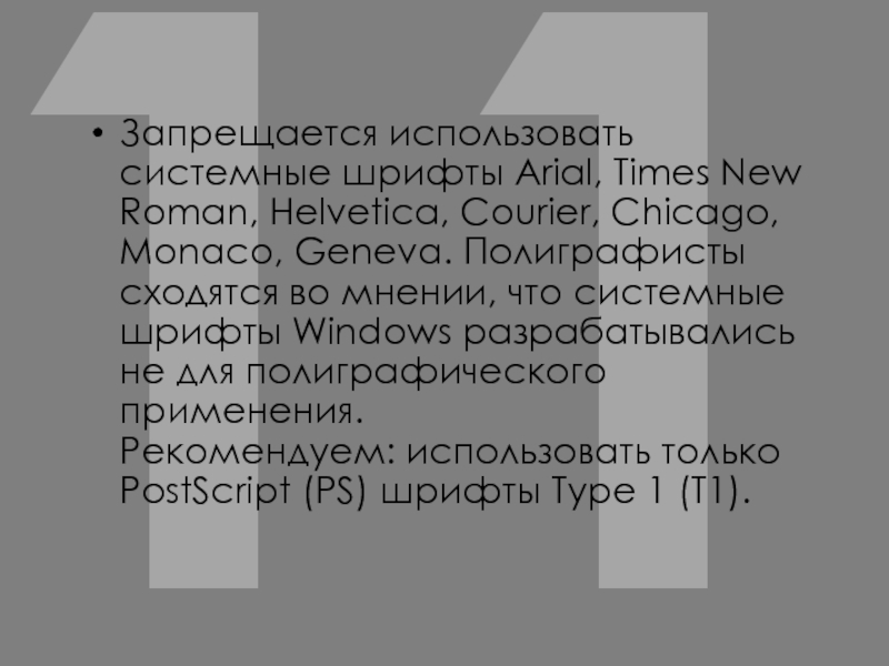 Запрещается использовать системные шрифты Arial, Times New Roman, Helvetica, Courier, Chicago,