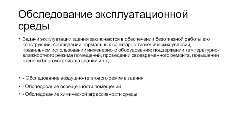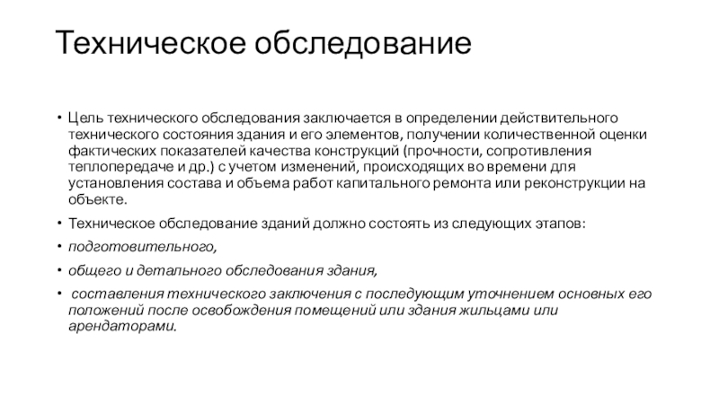 Цель комплексного обследования технического состояния здания (сооружения) заключается в определении действительного технического состояния здания (сооружения) и его элементов, получении количественной оценки фактических показателей качества конструкций (прочности, сопротивления теплопередаче и др.) с учетом изменений, происходящих во времени, для установления состава и объема работ по капитальному ремонту или реконструкции.