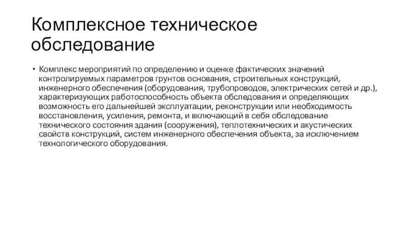 электрических сетей и др.), характеризующих работоспособность объекта обследования и определяющих возможность его дальнейшей эксплуатации, реконструкции или необходимость восстановления, усиления, ремонта, и включающий в себя обследование технического состояния здания (сооружения), теплотехнических и акустических свойств конструкций, систем инженерного обеспечения объекта, за исключением технологического оборудования.