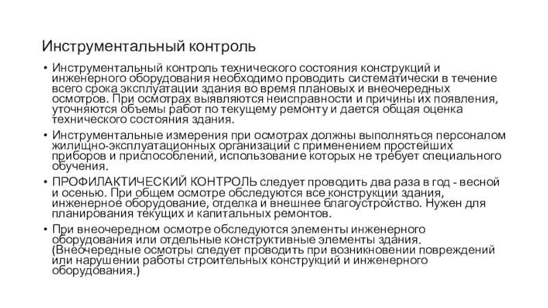 ПРОФИЛАКТИЧЕСКИЙ КОНТРОЛЬ следует проводить два раза в год - весной и осенью. При общем осмотре обследуются все конструкции здания, инженерное оборудование, отделка и внешнее благоустройство. Нужен для планирования текущих и капитальных ремонтов.