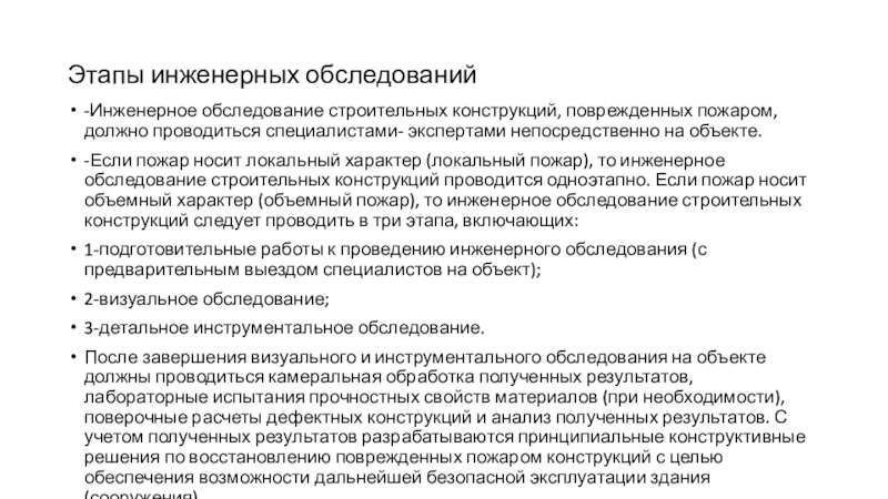 пожар), то инженерное обследование строительных конструкций проводится одноэтапно. Если пожар носит объемный характер (объемный пожар), то инженерное обследование строительных конструкций следует проводить в три этапа, включающих: