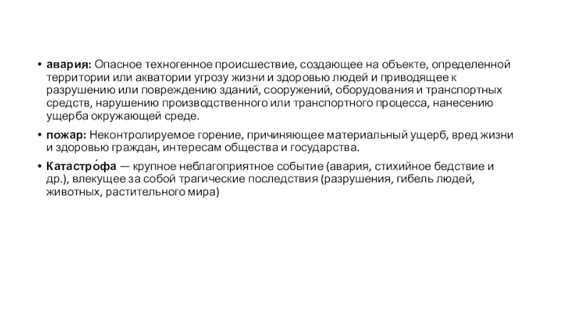 Слайд 14авария: Опасное техногенное происшествие, создающее на объекте, определенной территории или