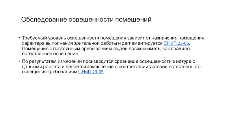 По результатам измерений производится сравнение освещенности в натуре с данными расчета и делается заключение о соответствии условий естественного освещения требованиям СНиП 23-05.