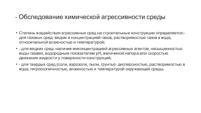 - для жидких сред- наличие миконцентрацией агрессивных агентов, насыщенностью воды газами, водородным показателем рН, величиной напора или скоростью движения жидкости у поверхности конструкций;