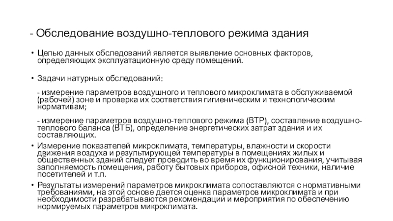 - измерение параметров воздушно-теплового режима (ВТР), составление воздушно-теплового баланса (ВТБ), определение энергетических затрат здания и их составляющих.