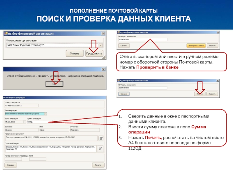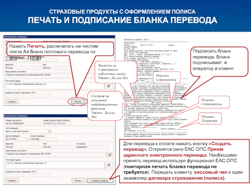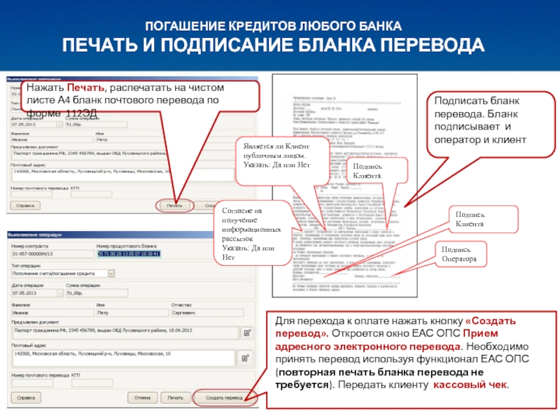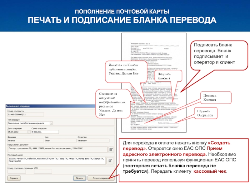 Подписать бланк перевода. Бланк подписывает и оператор и клиент