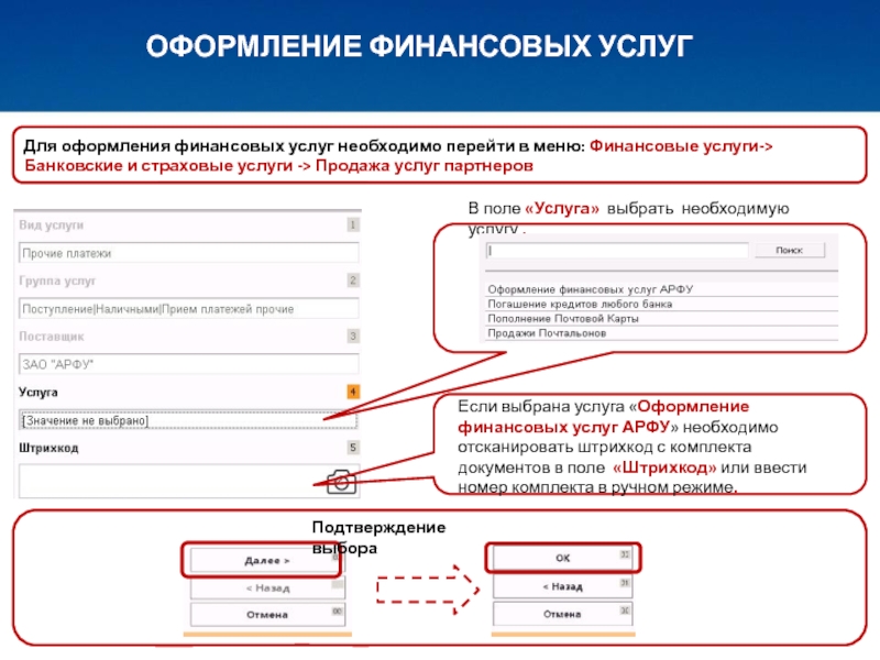 Если выбрана услуга «Оформление финансовых услуг АРФУ» необходимо отсканировать штрихкод с комплекта документов в поле «Штрихкод» или ввести номер комплекта в ручном режиме.