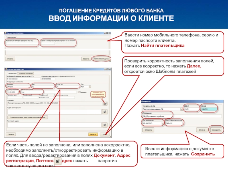 Если часть полей не заполнена, или заполнена некорректно, необходимо заполнить/откорректировать информацию в полях. Для ввода/редактирования в полях Документ, Адрес регистрации, Почтовый адрес нажать напротив соответствующего поля.