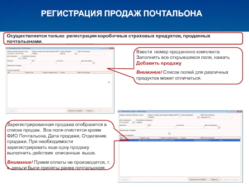 Осуществляется только регистрация коробочных страховых продуктов, проданных почтальонами.
