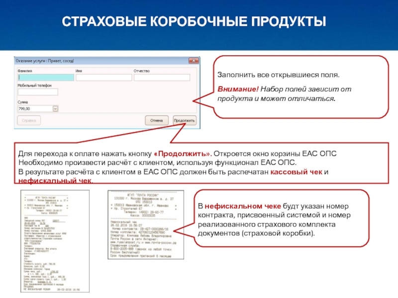 В нефискальном чеке будт указан номер контракта, присвоенный системой и номер реализованного страхового комплекта документов (страховой коробки).
