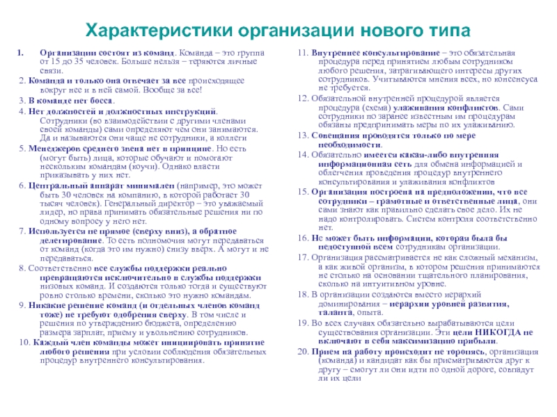 17. Организация рассматривается не как сложный механизм, а как живой организм, в котором решения принимаются не столько на основании тщательного планирования, сколько на интуитивном уровне.
