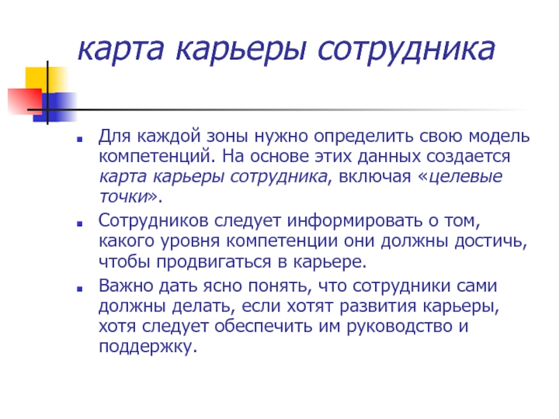 Важно дать ясно понять, что сотрудники сами должны делать, если хотят развития карьеры, хотя следует обеспечить им руководство и поддержку.